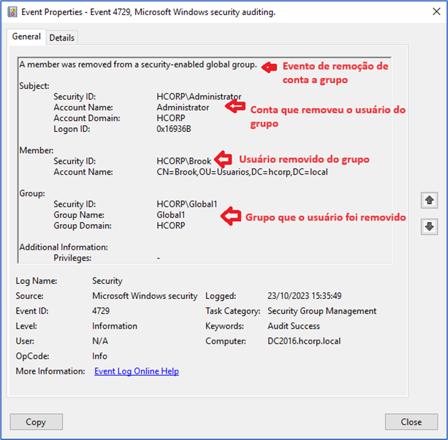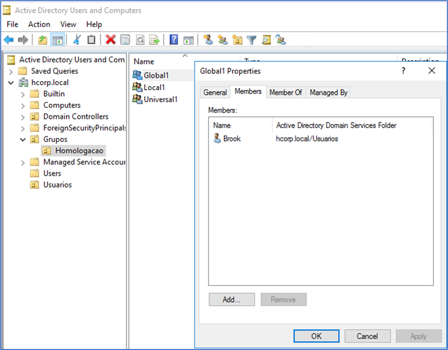 Eventos de alteração de grupo e do usuário Brook sendo removido do grupo global Global1