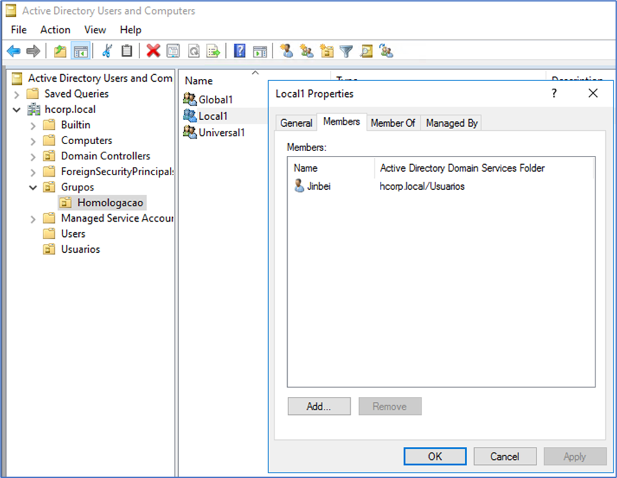 O usuário Jinbei foi adicionado ao grupo de domínio local Local1