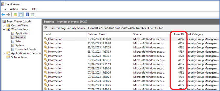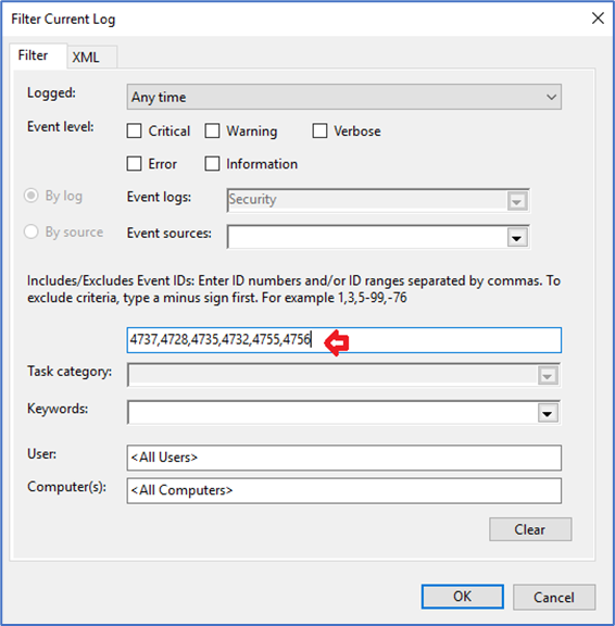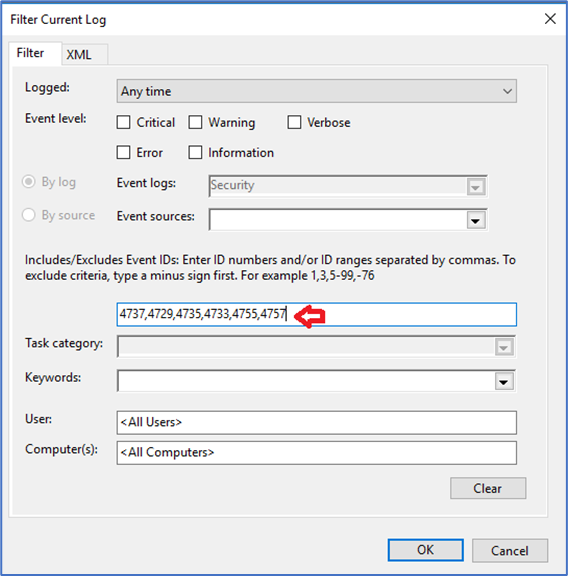 $EventIDs = 4737, 4728, 4735, 4732, 4755, 4756, 4729, 4733, 4757