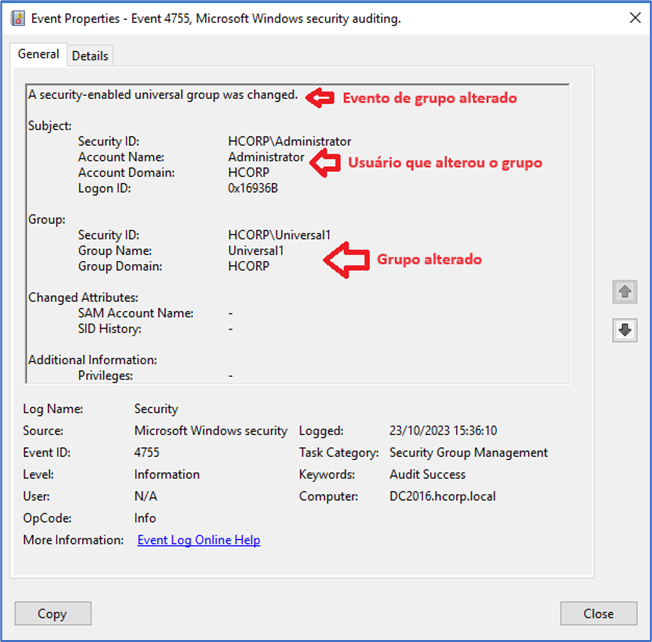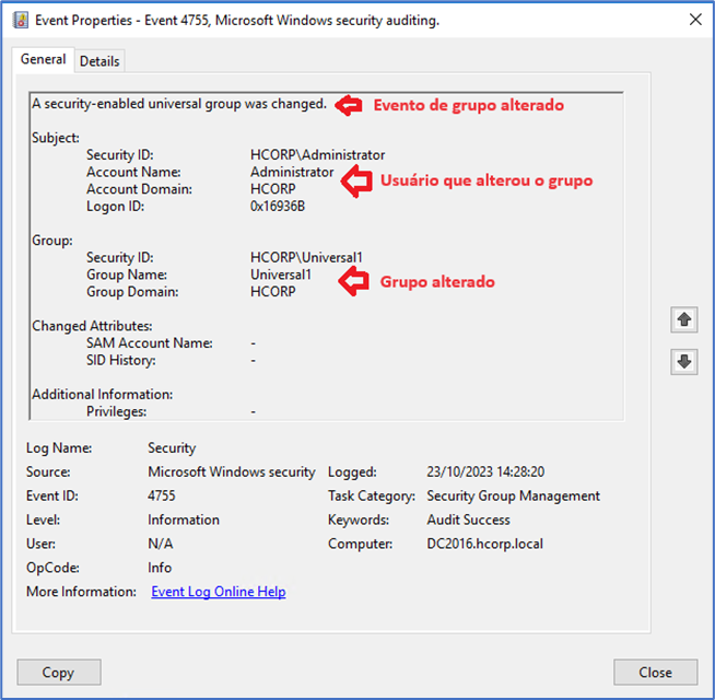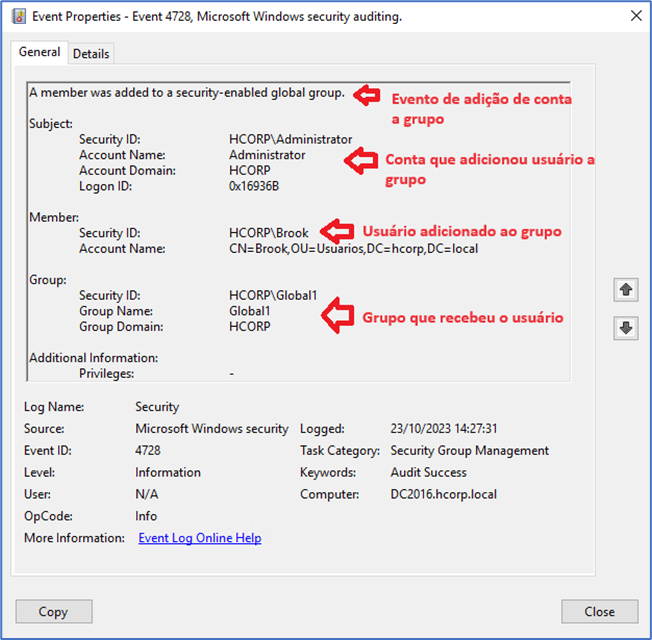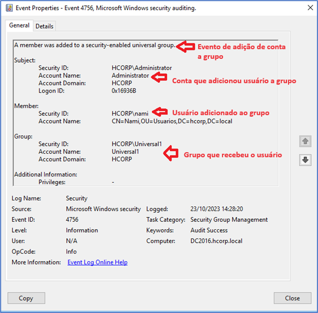 Os eventos de adição e remoção de usuários a grupos são diferentes para cada escopo em específico. São gerados dois eventos seguidos, um de alteração de grupo e outro de adição do usuário ao grupo.