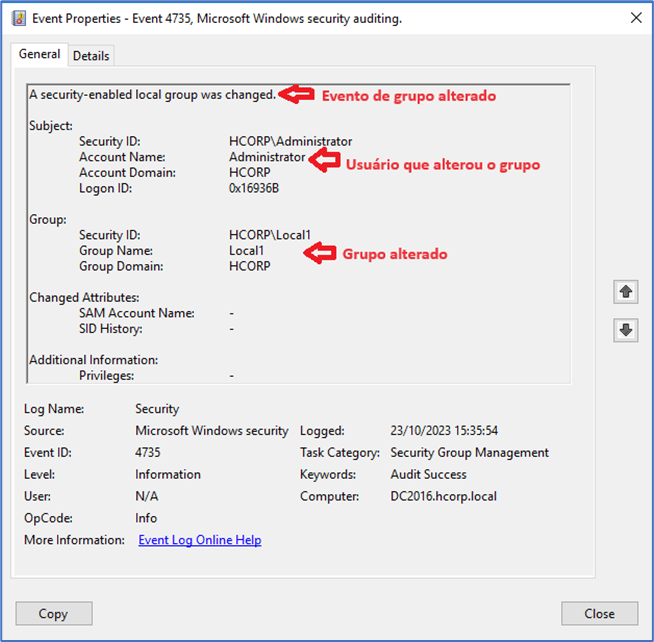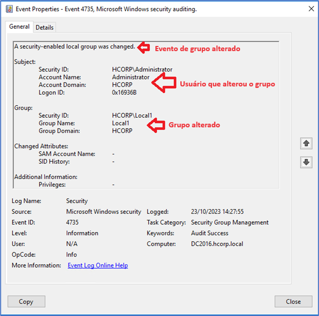 Eventos de alteração de grupo e do usuário Jinbei adicionado ao grupo de domínio local Local1