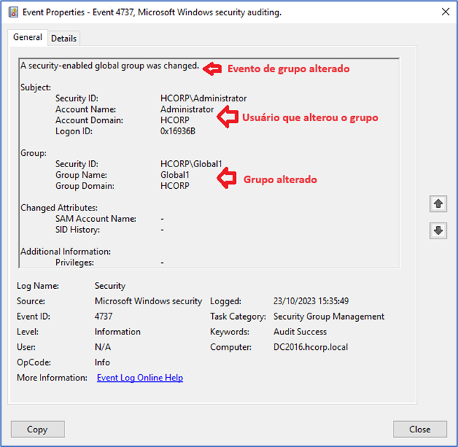 Realize o filtro para os seguintes eventos 4737, 4729, 4735, 4733, 4755 e 4757.