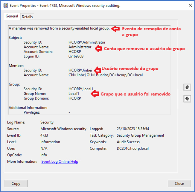 Eventos de alteração de grupo e do usuário Jimbei sendo removido do grupo de domínio local Local1