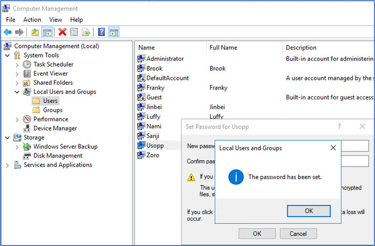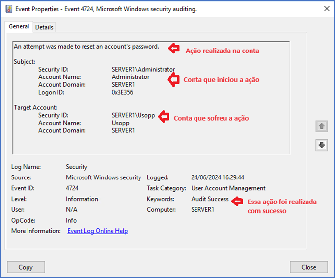 No evento é possível verificar se a ação foi com sucesso, o usuário que alterou a senha e o usuário que a senha foi alterada. Neste caso o usuário administrator conseguiu alterar a senha do usuário usopp com sucesso. Em Subject é o usuário que realizou a ação, em Target Account é o usuário que sofreu a ação.