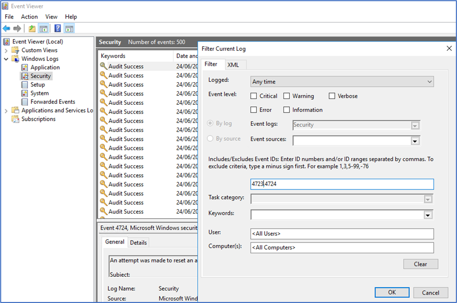 No campo Include/Excludes Event IDs informe os IDs dos eventos que neste caso serão 4723 e 4724. Os eventos devem ser separados por vírgula. Clique em OK.