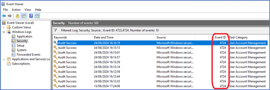 Os eventos 4723 e 4724 serão filtrados. Procure o horário aproximado que o cliente reportou a solicitação e abra o evento.