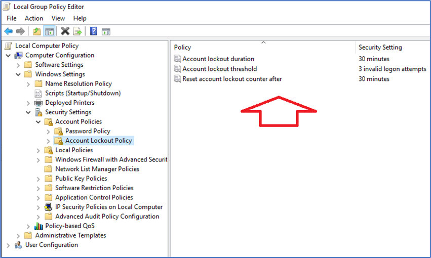 Por padrão os administradores configuram as políticas de bloqueio de conta na GPO Default Domain Policy quando o servidor é membro do domínio. Porém quando o servidor está em WORKGROUP a política de bloqueio de conta é configurada na diretiva local, que fica localizada no caminho Local Computer Policy\Computer Configuration\Windows Settings\Secutiry Settings\Account Policies\Accoung Lockout Policy.