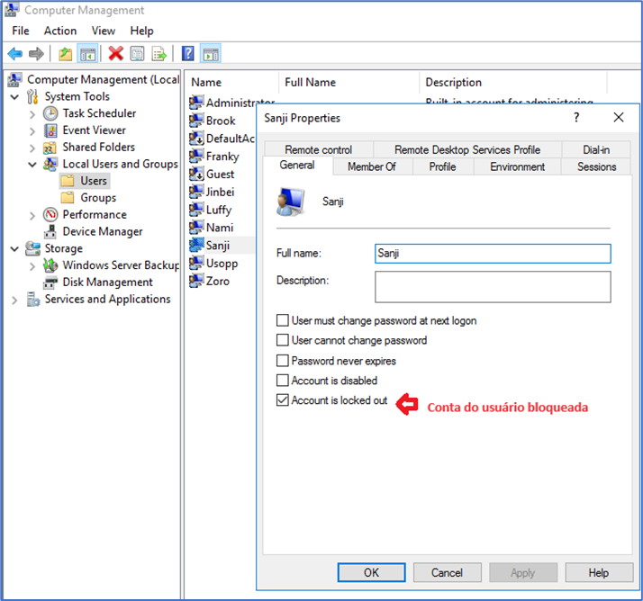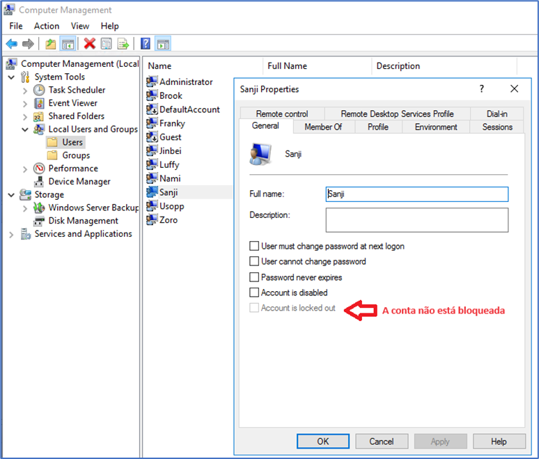 Iremos simular o bloqueio de conta do usuário Sanji. Nas propriedades da conta do usuário no servidor é possível visualizar o status da conta, que nesse momento não está bloqueada.