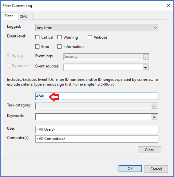 No campo Include/Excludes Event IDs informe o ID do evento que neste é 4740. Clique em OK.