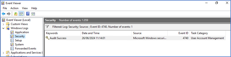 O evento 4740 é filtrado. Procure o horário aproximado que o cliente reportou a solicitação e abra o evento.