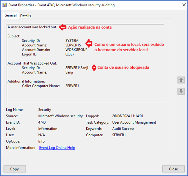Verifique que o evento registra o bloqueio da conta do usuário. Em Subject é o servidor que realizou o bloqueio da conta, o usuário SYSTEM é informado devido a ser uma ação do próprio servidor local, em Account That Was Locket Out é o usuário que sofreu a ação de conta bloqueada, em Additional Information é informado o computador de origem onde a conta do usuário foi bloqueada.