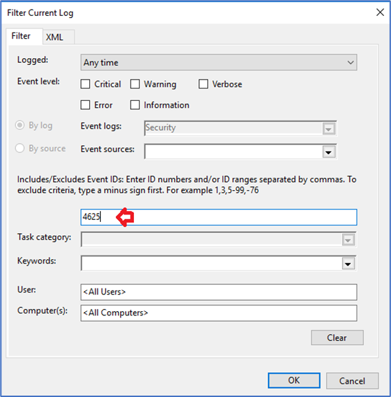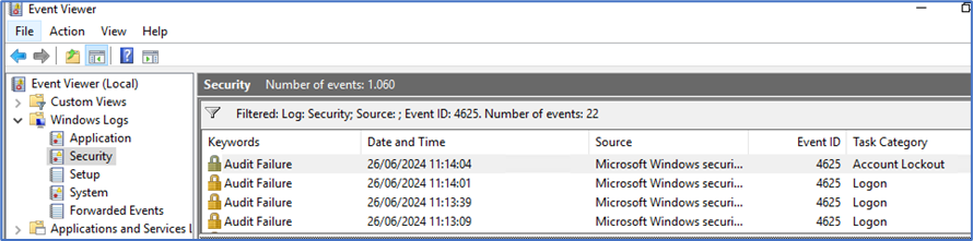 Também é possível identificar os eventos de bloqueio no servidor. Para isso realize logon no servidor/estação de trabalho com uma conta que possui permissões administrativas e abra o Even Viewer e realize um filtro procurando pelo ID de evento 4625.
