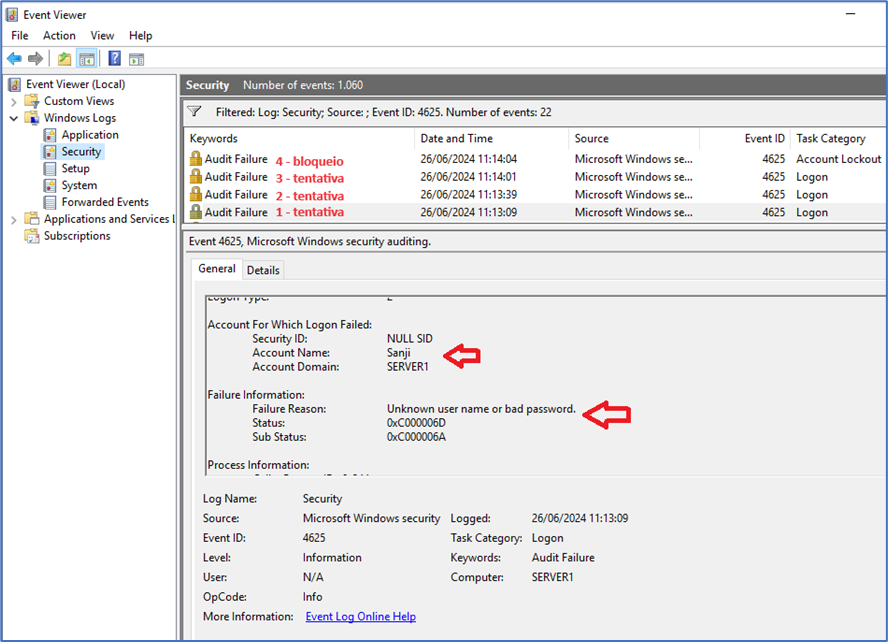O primeiro, segundo e terceiro evento são informadas as tentativas sem sucesso de acesso com a senha errada.