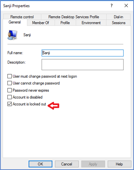 Iremos simular o desbloqueio de conta do usuário Sanji. Nas propriedades da conta do usuário no servidor é possível visualizar o status da conta, que nesse momento está bloqueada. Para desbloquear a conta marque a caixa Unlock account e clique em OK.