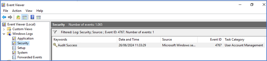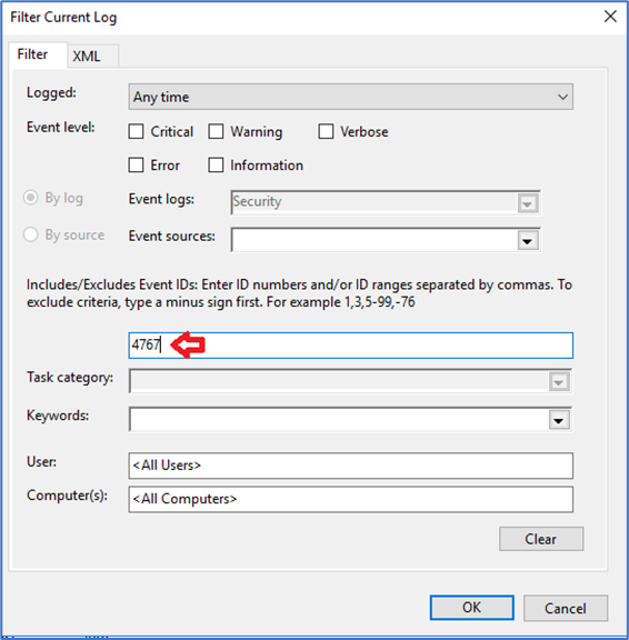 No servidor, realize um novo filtro no Event Viewer pelo ID 4767.