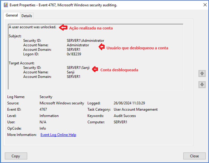 Neste caso o usuário administrator conseguiu desbloquear a conta do usuário Sanji com sucesso. Em Subject é o usuário que realizou a ação, em Target Account é o usuário que sofreu a ação.
