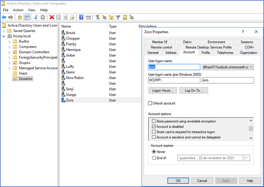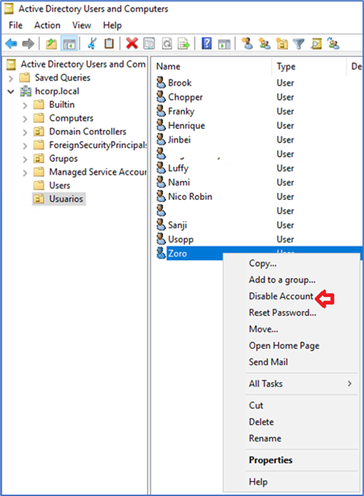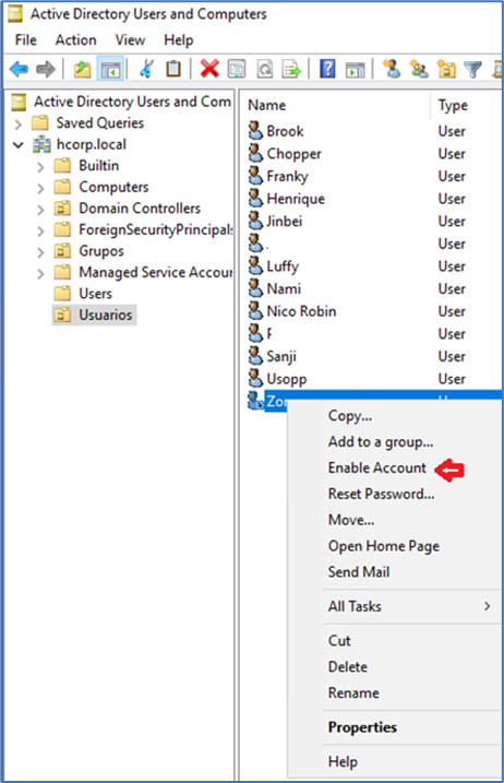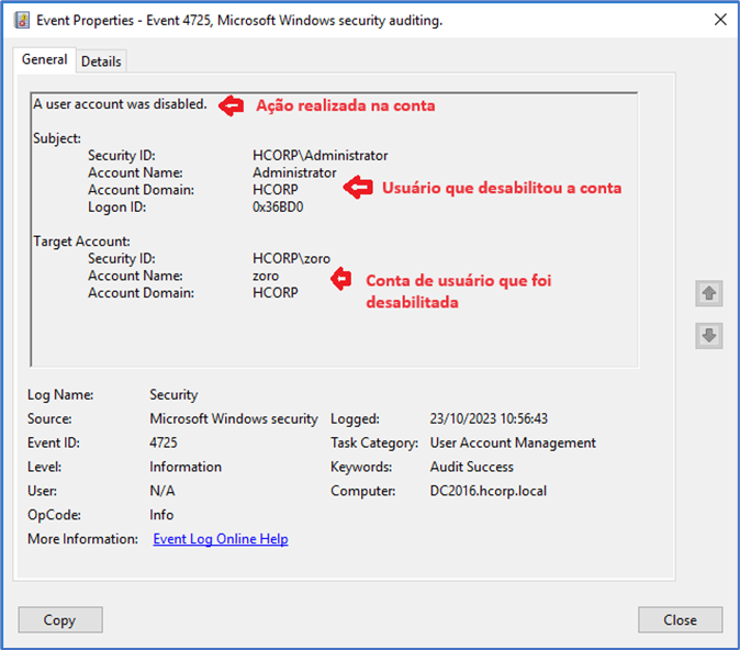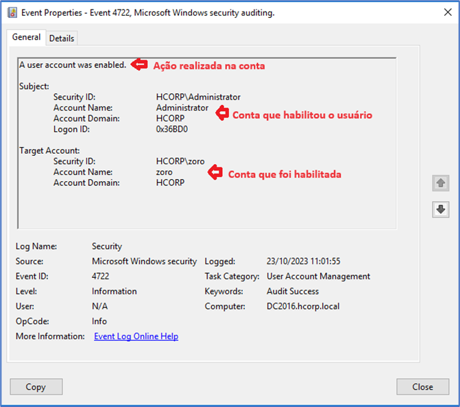 Neste caso o usuário administrator habilitou a conta do usuário Zoro com sucesso. Em Subject é o usuário que realizou a ação, em Target Account é o usuário que sofreu a ação.