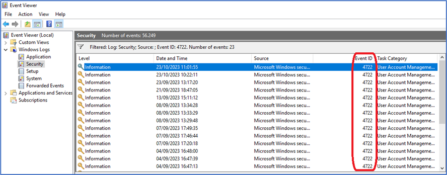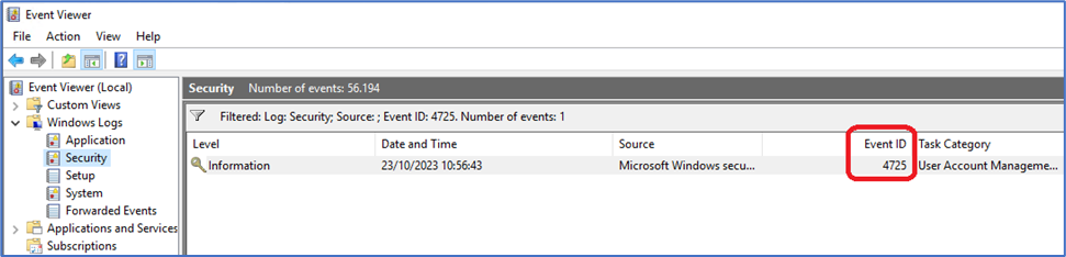 No campo Include/Excludes Event IDs informe o ID do evento que neste é 4725. Clique em OK.