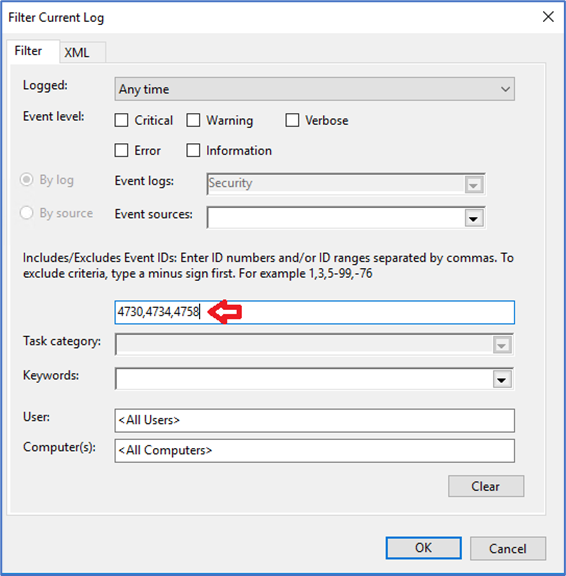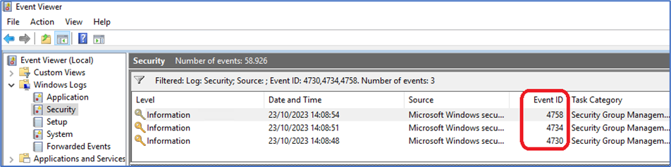 Filtre novamente através dos eventos 4730, 4734 e 4758.