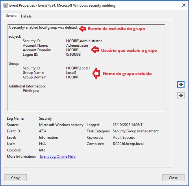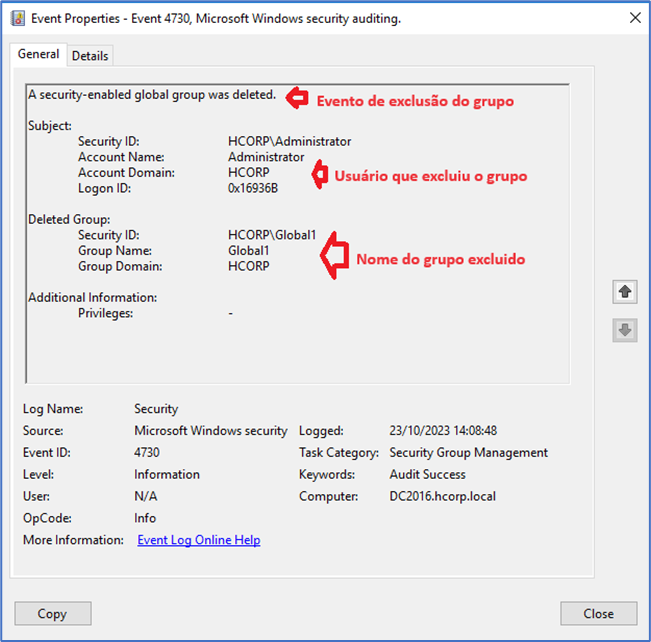 Concluímos que através desses procedimentos é possível identificar um usuário que criou ou excluiu um grupo no Active Directory com sucesso.