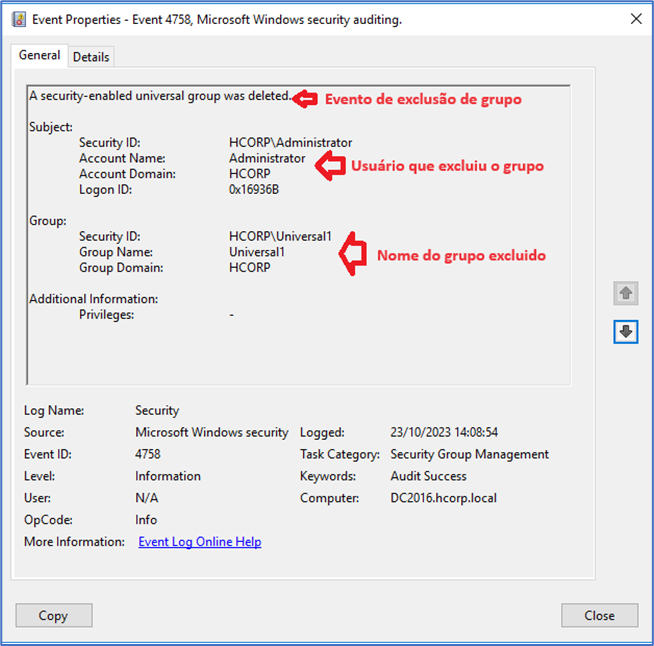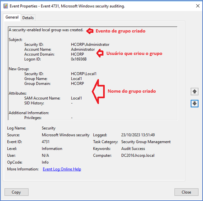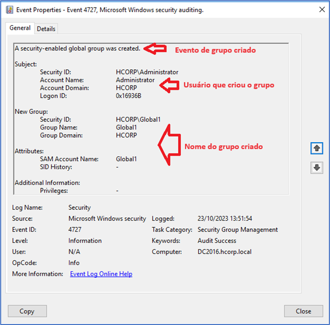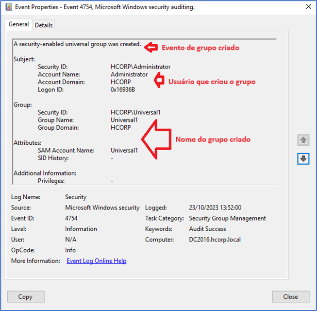 Os eventos 4727, 4731 e 4754 serão filtrados. Procure o horário aproximado que o cliente reportou a solicitação e abra o evento.