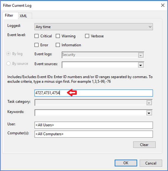 No campo Include/Excludes Event IDs informe os IDs dos eventos que neste caso serão 4727, 4731 e 4754. Os eventos devem ser separados por vírgula. Clique em OK.