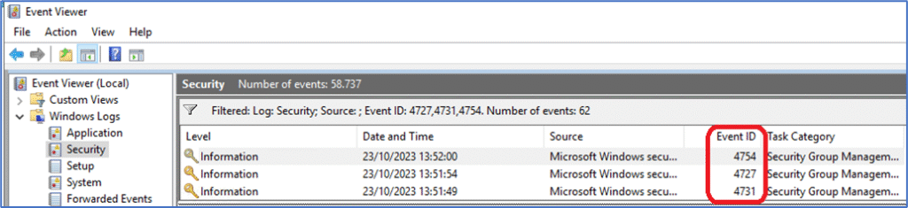 $EventIDs = 4727, 4731, 4754, 4730, 4734, 4758