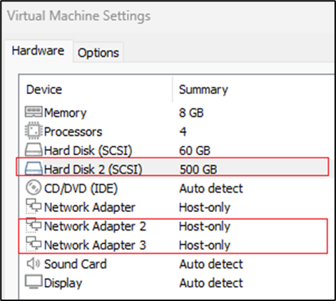Adicione um disco e duas interfaces de rede a máquina virtual do TrueNAS. No meu laboratório adicionei um disco de 500GB e duas interface de rede na rede Host-only.