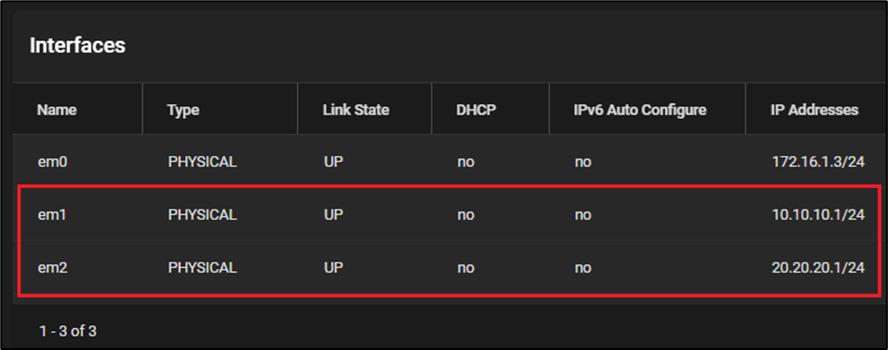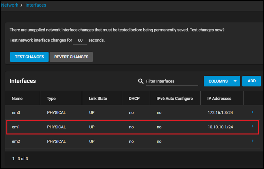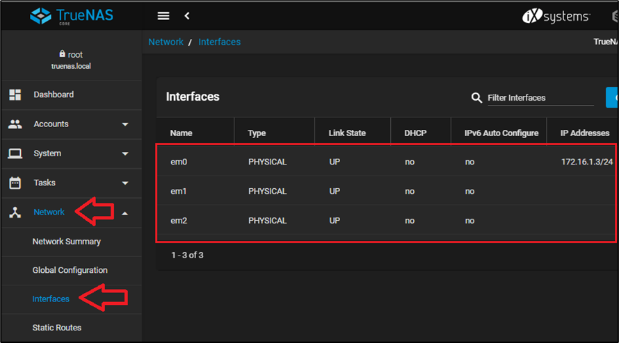 Realize acesso ao TrueNAS, clique em Network\Interfaces. Verifique que o storage possui três interfaces, uma de gerencia e as duas que serão adicionadas para o iSCSI.