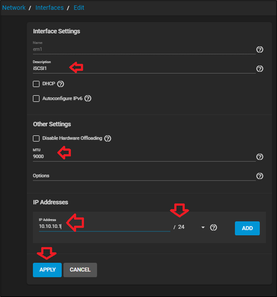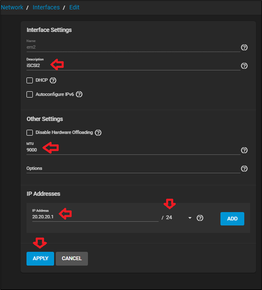 Informe uma descrição (opcional). É uma boa pratica utilizar jumbo frame na rede iSCSI, por isso configurei o MTU para 9000, porém é importante verificar com seu administrador de rede se as portas do switch possuem essa configuração. Insira o IP e a máscara de rede desejada e depois clique em APPLY.
