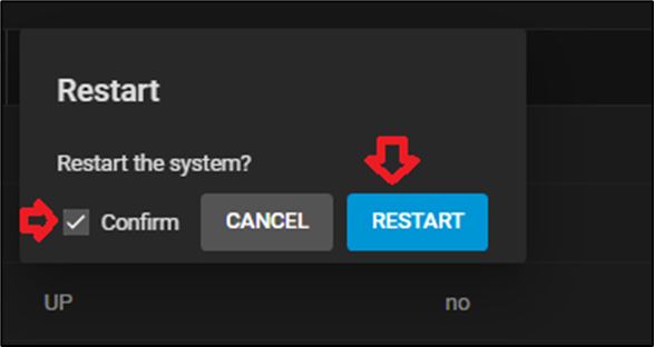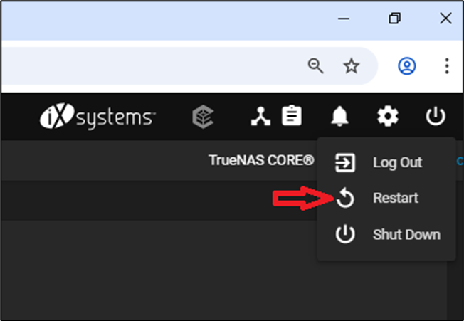 Agora é necessário reiniciar o storage, para isso no canto superior direito clique no ícone de power e selecione Restart.
