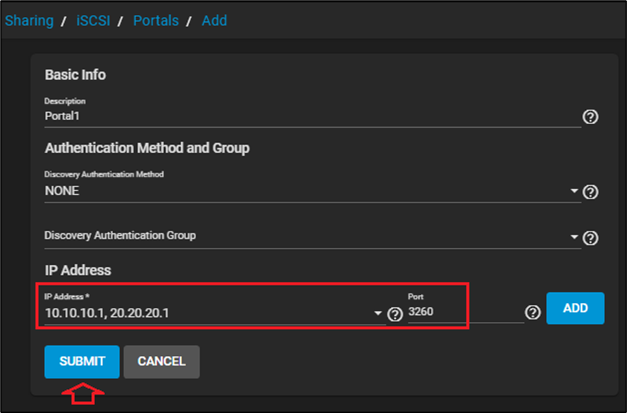 Certifique-se que selecionou os IPs corretos, mantenha a porta padrão 3260 e clique em SUBMIT.
