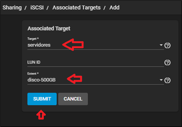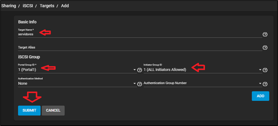 Uma janela de configuração será aberta. Configure o Target Name como desejado, em Portal Group ID informe o Portal criado anteriormente, em Iniciator Group ID informe o Initiator criado. Como não criamos nenhuma autenticação não é necessário configurar o Authentication Method e Authentication Group Number, clique em SUBMIT.