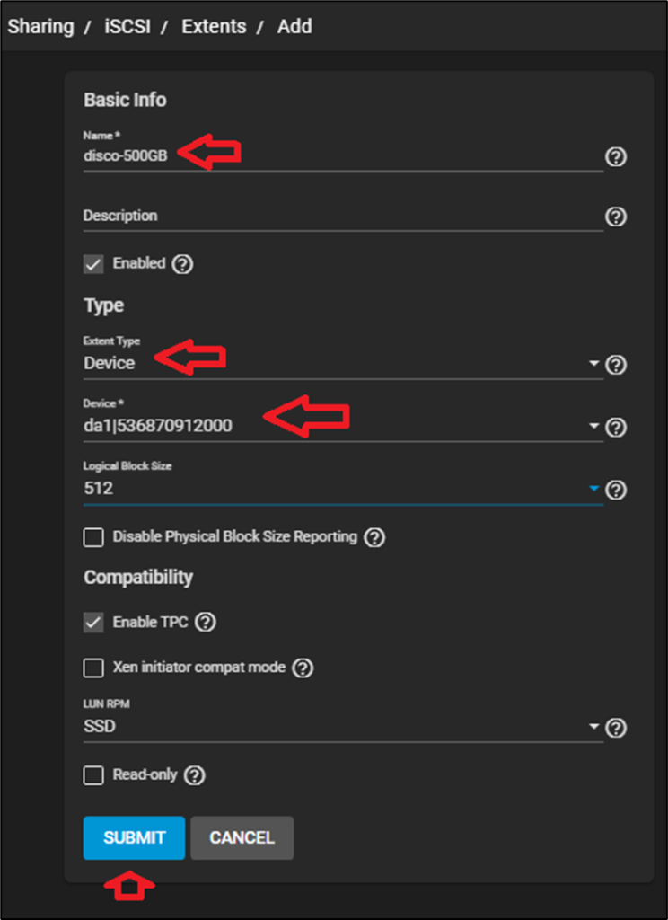 Será exibida uma janela de configuração. Em Name informe um nome para o volume, em Extent Type mantenha Device, pois ele irá utilizar os discos disponíveis do servidor, pois também é possível utilizar pastas. Em Device selecione o disco que foi adicionado ao servidor do storage/TrueNAS. É possível realizar outras configurações, como alterar o tamanho do bloco do volume, após realizar as configurações clique em SUBMIT.