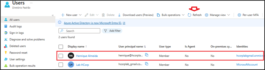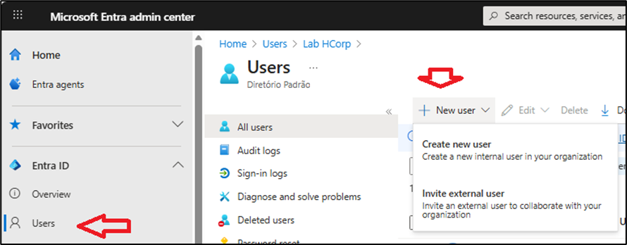 Realize acesso ao portal do Entra Admin Center através da URL https://entra.microsoft.com/ Na seção Entra ID selecione Users e clique em New User\Create New User.