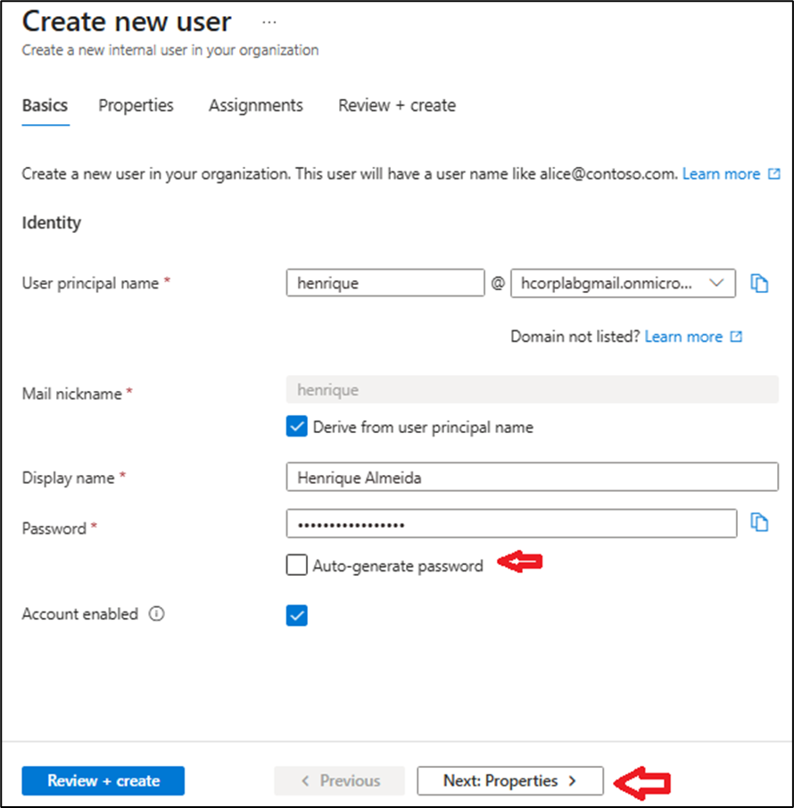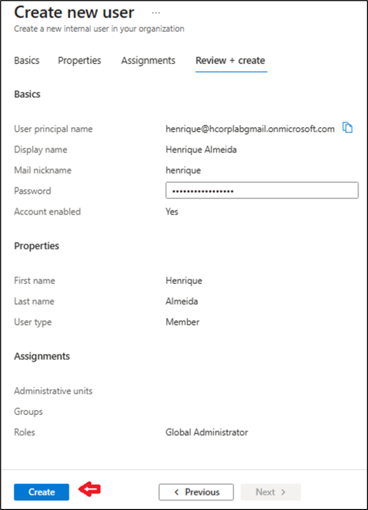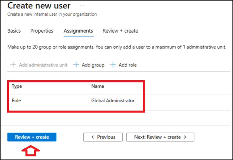 Verifique que a role foi atribuída ao novo usuário, clique em Review + create.