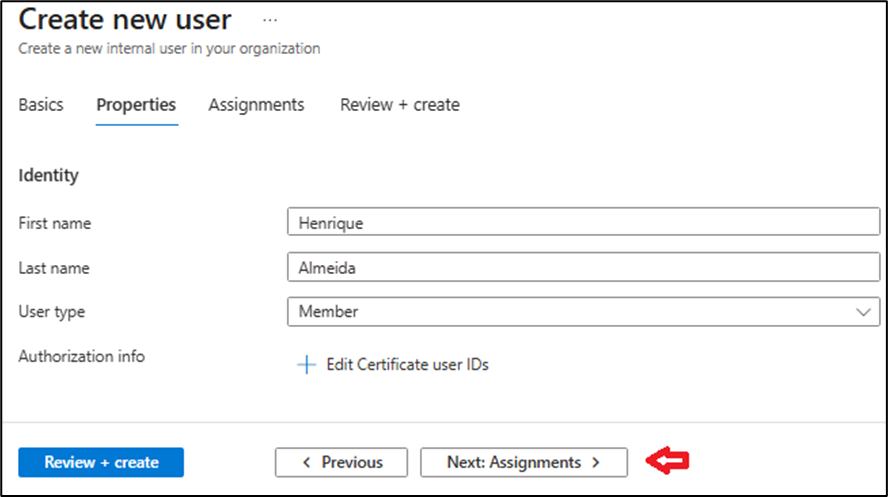Na próxima janela insira as informações do usuário e clique em Next: Assignments.