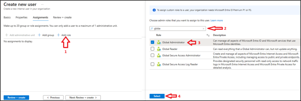 Na aba Assignment, clique em Add role, será aberta ao lado uma janela para selecionar as roles, pesquise a palavra “global” e marque a role Global Administrator, depois clique em Select.