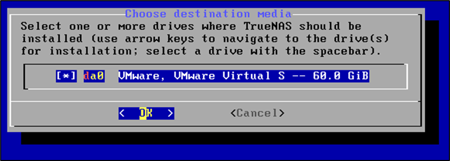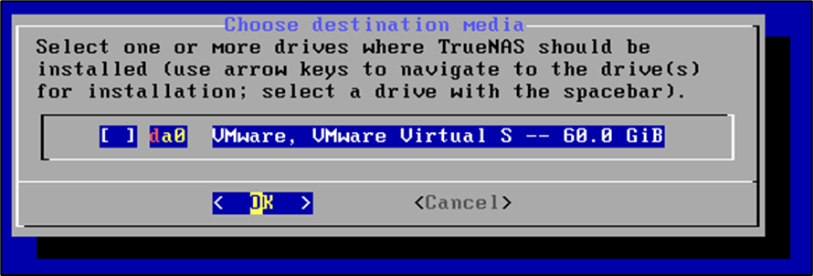 Selecione o disco e clique com a tecla barra de espaço (Spacebar) em cima do disco para marcá-lo [*] e clique em OK.