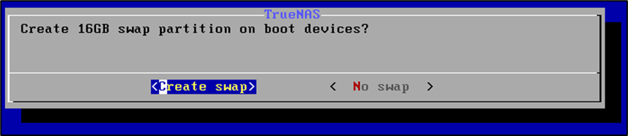 É necessário criar o SWAP para o sistema operacional, como essa máquina virtual possui 8GB, o setup recomenda um SWAP de 16GB. O valor do SWAP vai mudar de acordo com a quantidade de memória que foi configurada na máquina virtual. Clique em Create swap.