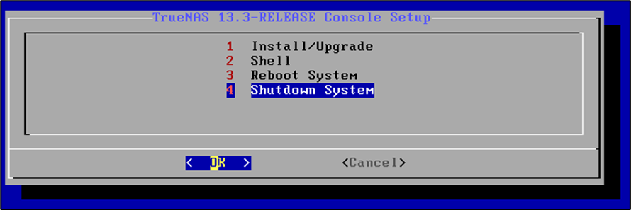 Ele retornará a tela de console do setup, selecione a opção 4 Shutdown System, e clique em OK.