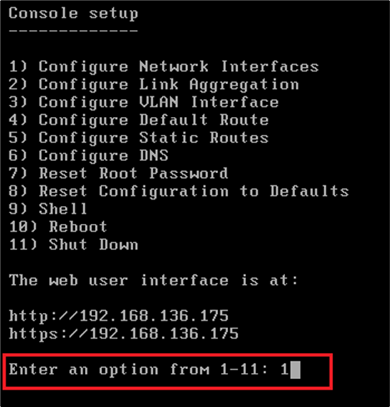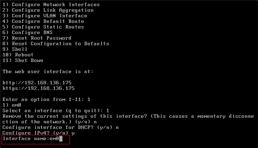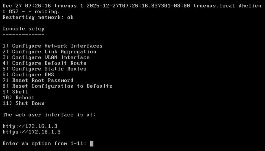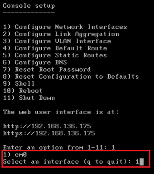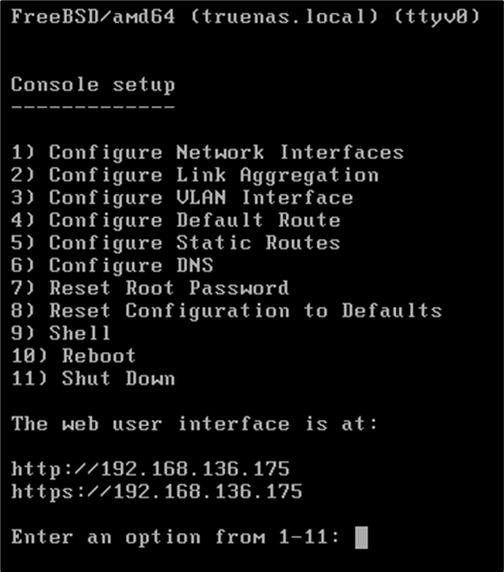 Ao finalizar o carregamento do SO ele irá configurar automaticamente um IP, porém utilizaremos outro. 90% da gestão do TrueNAS é realizado na console WEB, porém essa primeira parte de configuração de rede é necessário através dessa console.