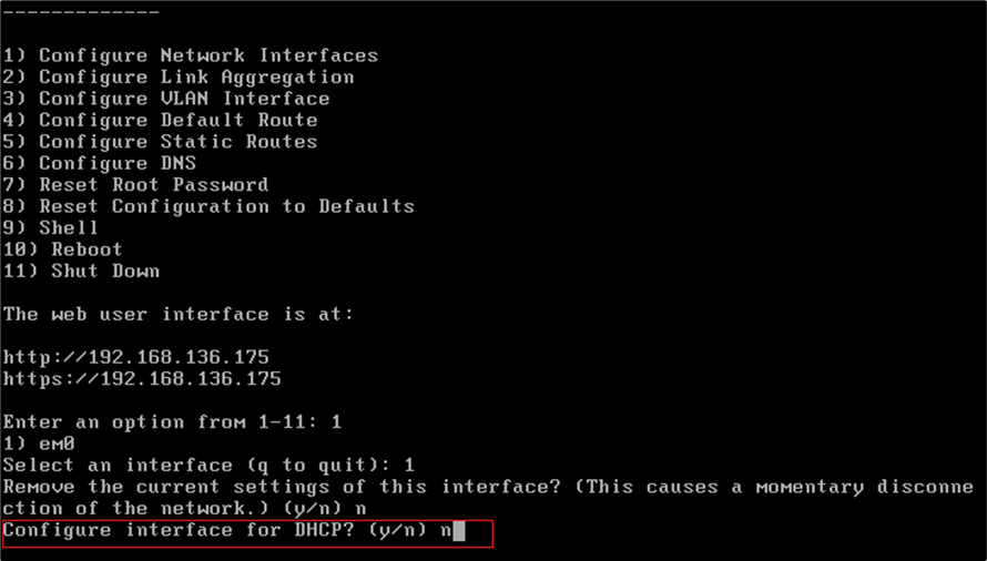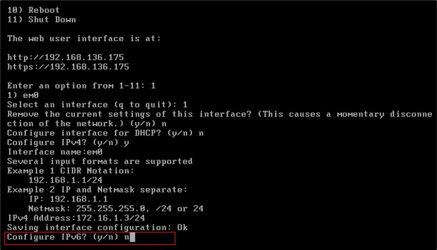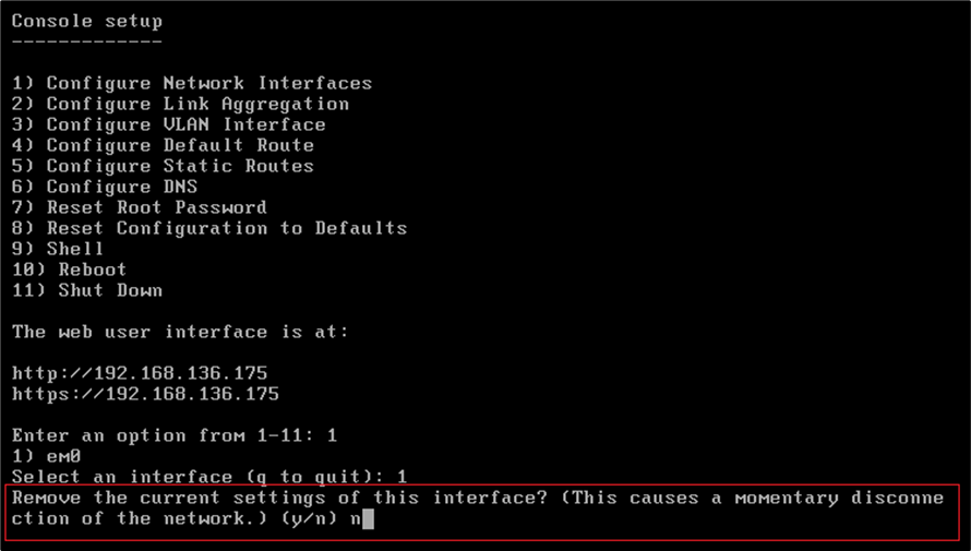Essa opção é para resetar as configurações da interface (selecionando y) ou realizando uma nova configuração (selecionando n), informe n e clique em Enter.