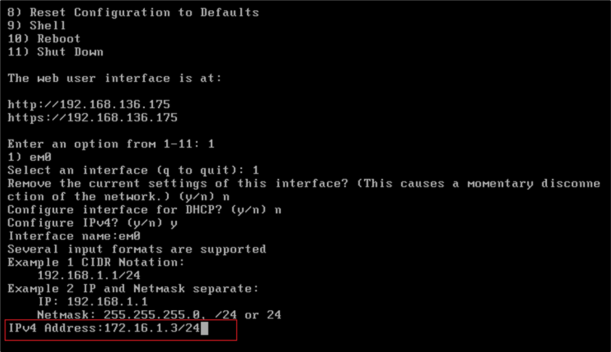 Precisamos configurar o IP correto, utilizaremos o IP 172.16.1.3/24 para a rede de gerência. Para isso informe o número 1 e pressione Enter.