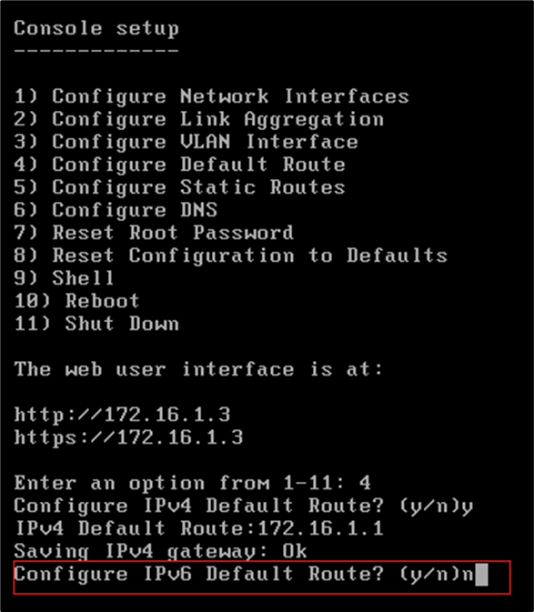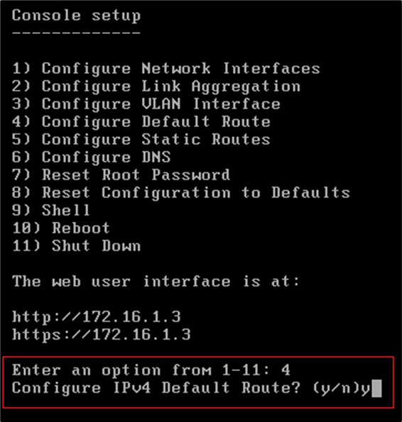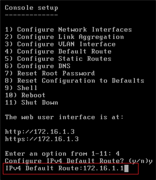 Para configurar o default gateway realize os seguintes passos. Ao voltar a tela do Console setup, informe 4 e clique em Enter. Depois informe y para configurar o IP do gateway da rede.