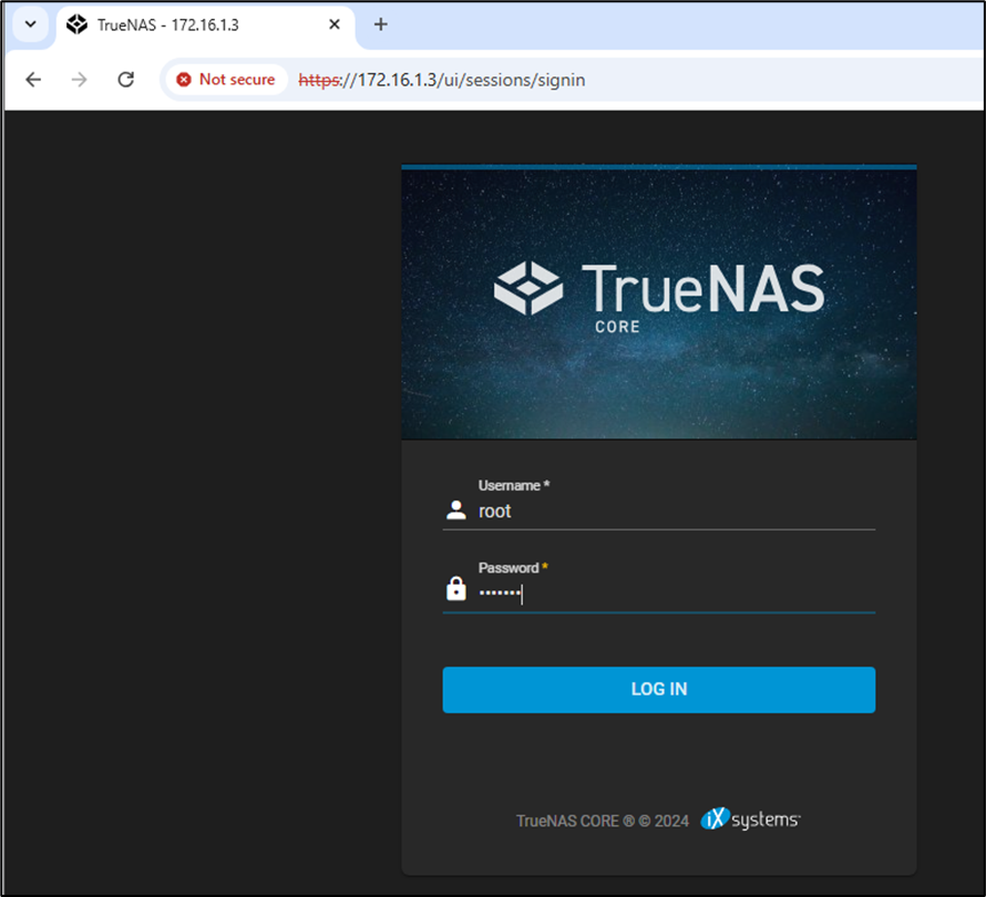 Após realizar essas configurações, logue em um servidor na mesma rede do FreeNAS (JUMP Server) abra um navegador e realize acesso ao console do storage utilizando o IP configurado.