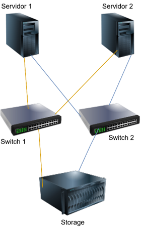 O ambiente de rede também deve possuir redundância com dois switchs, e cada switch se conectando a uma interface diferente do servidor e do storage.