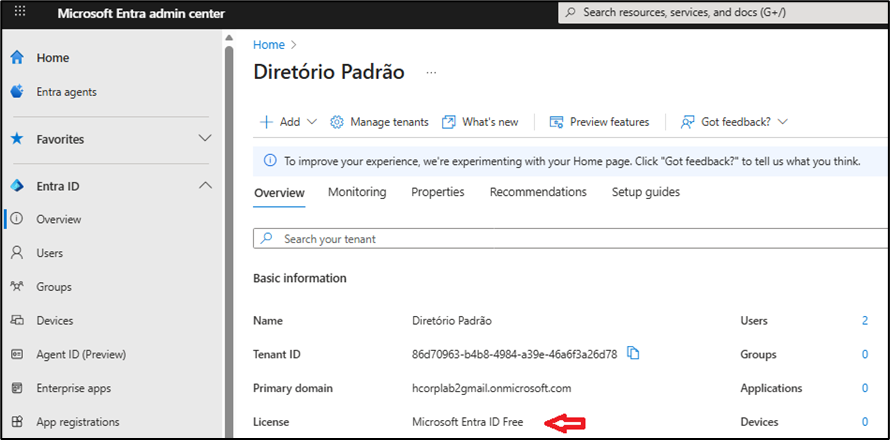 Realize acesso ao Entra admin center através da URL https://entra.microsoft.com/ na seção Entra ID clique em Overview e verifique que no momento a sincronização não está habilitada.