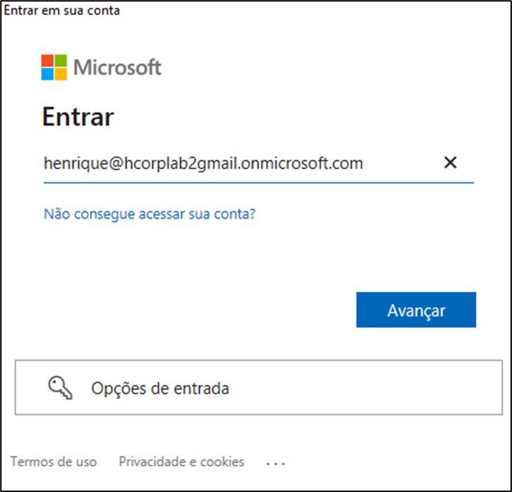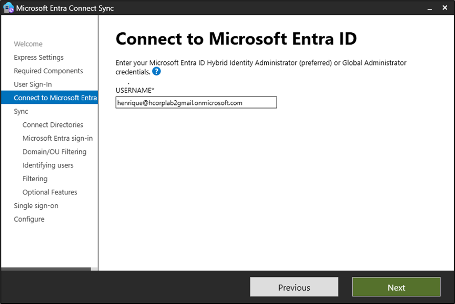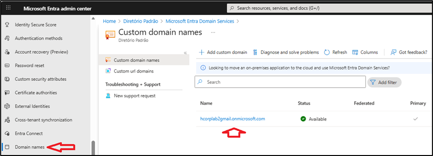 O assistente do Microsoft Entra Connect usa o atributo userPrincipalName ou permite que você especifique o atributo (em uma instalação personalizada) a ser usado localmente como o UserPrincipalName no Microsoft Entra ID. Este é o valor usado para entrar no Microsoft Entra ID. Se o valor do atributo userPrincipalName não corresponder a um domínio verificado no Microsoft Entra ID, o Microsoft Entra ID o substituirá por um valor padrão como o .onmicrosoft.com. Cada diretório no Microsoft Entra ID vem com um nome de domínio integrado, no formato contoso.onmicrosoft.com, no nosso exemplo é o hcorplab2gmail.onmicrosoft.com, que permite começar a usar o Microsoft Entra ou outros serviços online da Microsoft. Mas você pode aprimorar e simplificar a experiência de login usando domínios personalizados.
