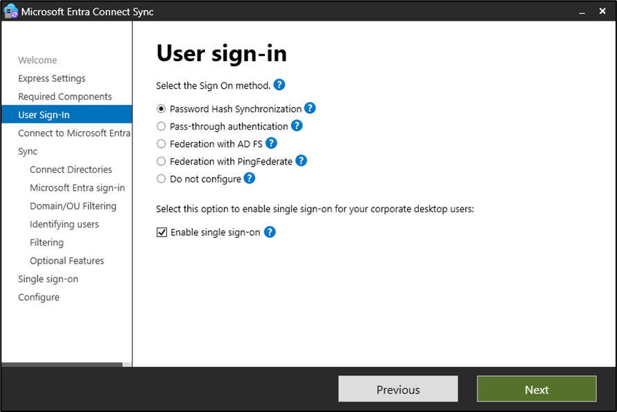 Na janela User Sign-In pode alterar de acordo com sua infraestrutura e organização, se tem ADFS, etc. No nosso laboratório utilizaremos o Password Hash Synchronization e marque a opção Enable single sign-on, essa é a configuração mais utilizadas pelas empresas. Clique em Next.